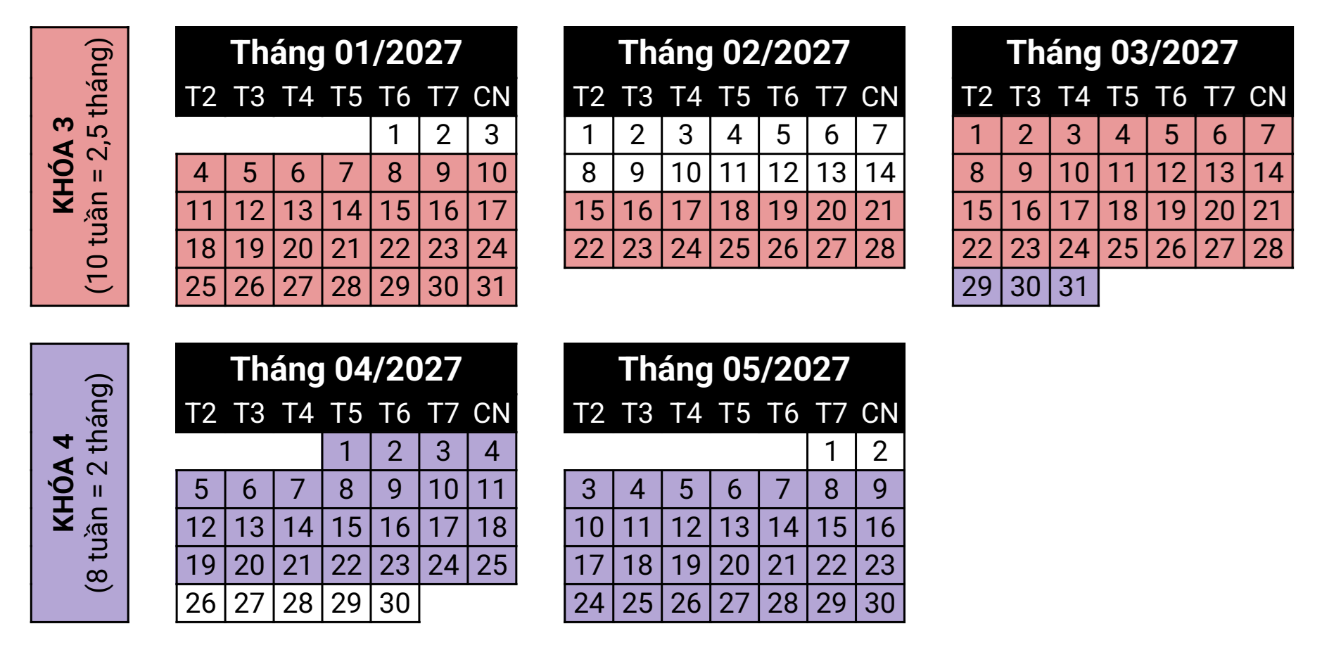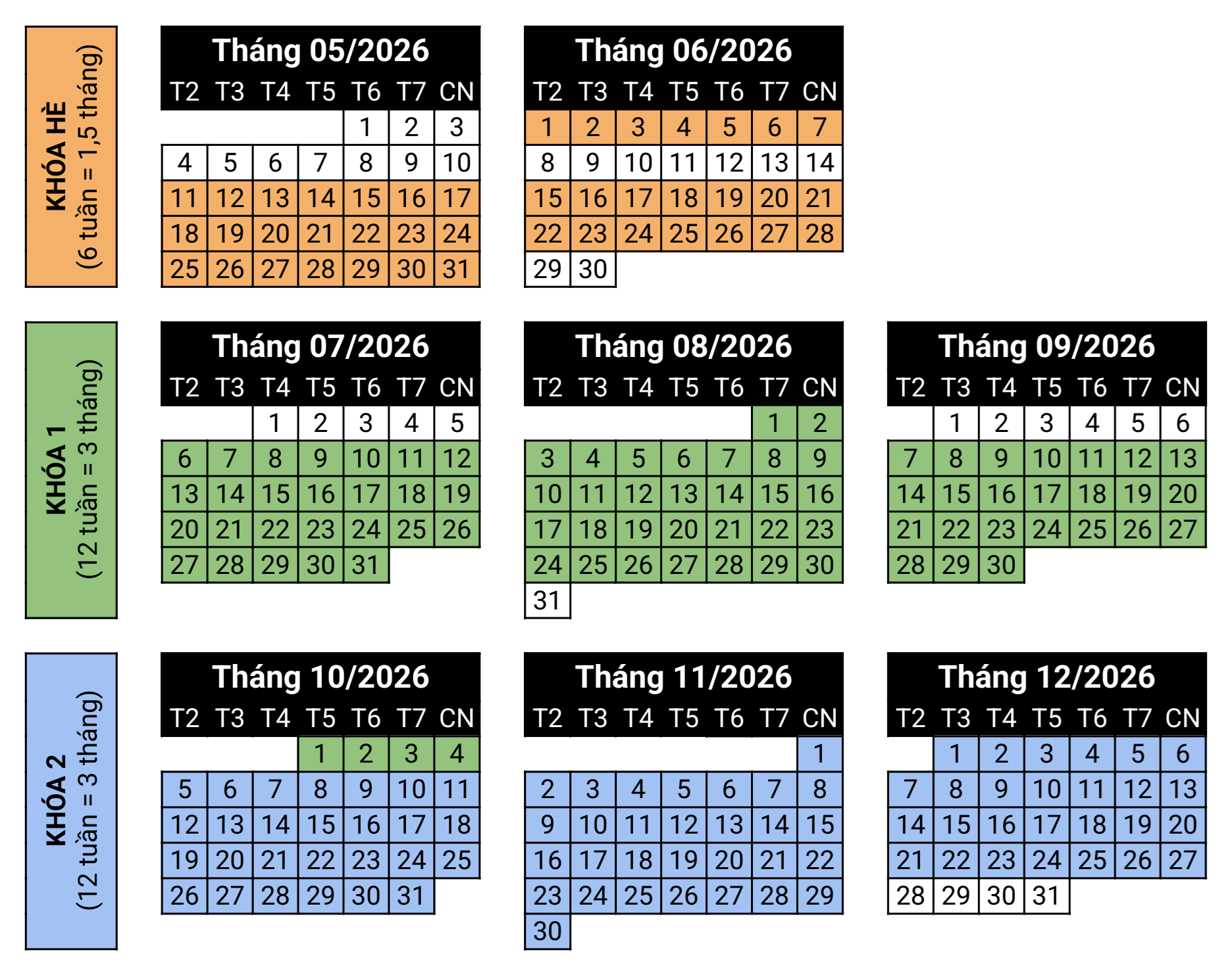 Sau khi kết thúc KHÓA HÈ, tháng 7 các lớp khai giảng KHÓA 1 theo lịch sau: